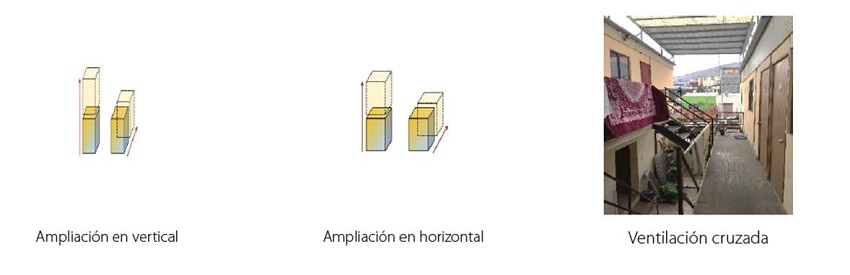 Desde las entrevistas en profundidad realizadas y del trabajo de campo se analiza cómo la residencia y el comercio migrante se van entremezclando en este deteriorado sector. Con respecto a las relaciones espaciales, se observa un predominio de viviendas pareadas, las cuales en un 100% de los casos analizados han sido ampliadas en estructura de madera tanto en un primer (horizontalmente) como en un segundo piso (verticalmente). Una migrante indica: “tenían la casa al lado y como decir en tren, así eran las piezas” (In, mujer colombiana de 52 años, comunicación personal). En relación con el medio ambiente, la fuerte radiación solar ha obligado a que un 50% de los espacios comunes analizados cuenten con soluciones que permitan una ventilación cruzada entre recintos (Figura 4).