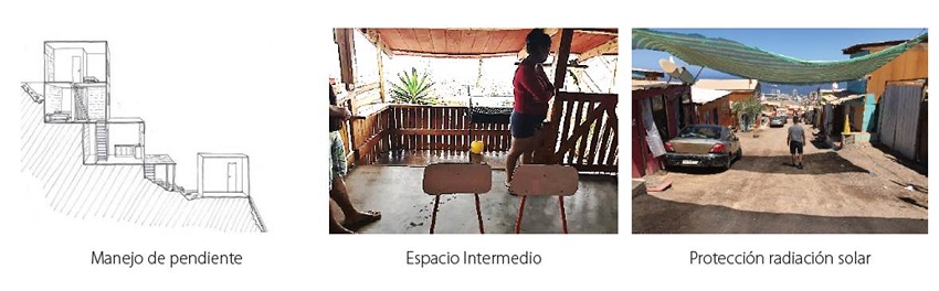 Se advierte cómo los migrantes empiezan a manejar variables como la pendiente y la radiación solar. En el recorrido participativo se observa cómo un 60% de las viviendas de los migrantes entrevistados maneja la pendiente en distintos desniveles, y un 80% de las viviendas maneja la radiación solar mediante espacios intermedios. Con respecto al espacio público, se analiza cómo la pendiente es absorbida por muretes de piedra, neumáticos o doca, y la alta radiación solar es controlada por toldos de malla raschel8 (Figura 5).