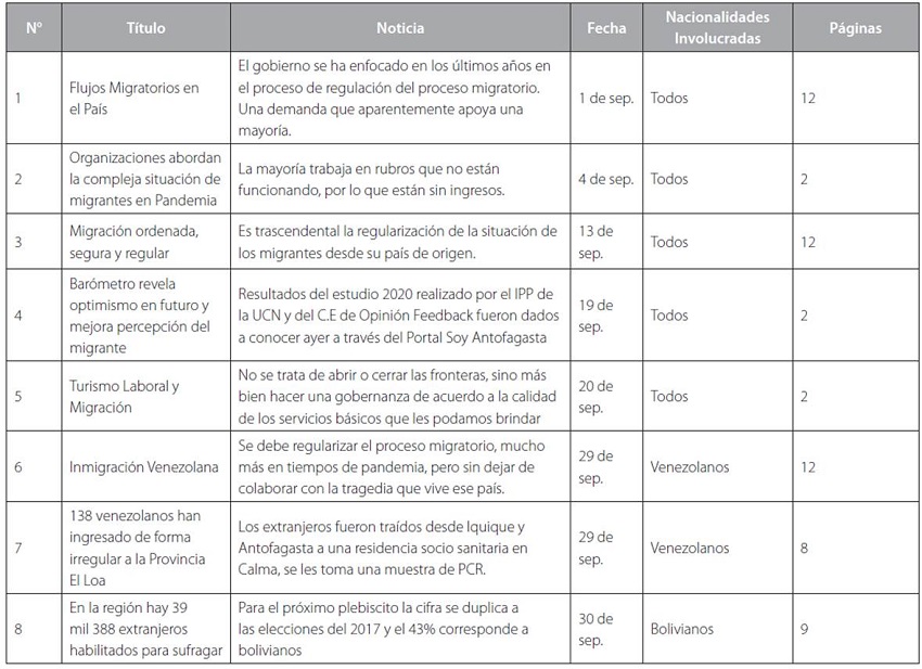 Con respecto a la estigmatización territorial, se analizan las referencias sobre migración en un diario local durante el mes de septiembre del año 2020, en el cual hubo ocho menciones, y donde quedó reflejado la contingencia sanitaria que afectó al país y al mundo. Una mención se refirió al centro de la ciudad (Av. Prat), es decir un 12,5% y cuatro a los campamentos emplazados en la periferia de la ciudad, por lo tanto, un 50% (Tabla 1). Cabe indicar que sólo una de las noticias le otorga un valor positivo a la migración. A su vez, la estigmatización también es padecida por los migrantes en los espacios personales. Una de las entrevistadas señala: “Me sentí discriminada porque decían que les quitábamos los maridos, muchas cosas. Pues que, en realidad, muchas cosas” (Ma, mujer colombiana de 23 años, comunicación personal).
