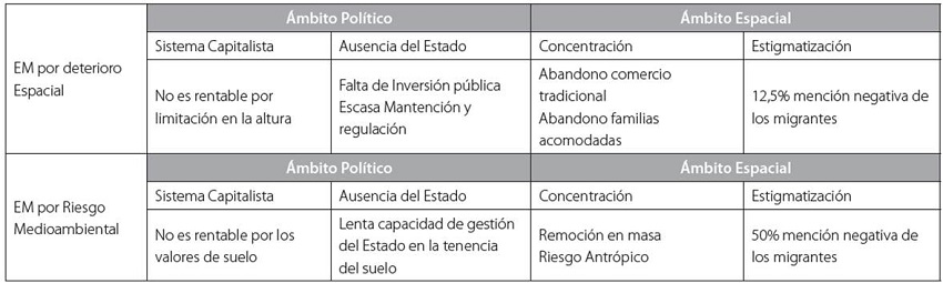 Los resultados de los ámbitos políticos y espaciales se resumen en la siguiente tabla 2, en la cual se observa como el sistema capitalista y la ausencia del Estado ha propiciado una condición de marginalidad que se estigmatiza mayormente en el EM por Riesgo Medioambiental.