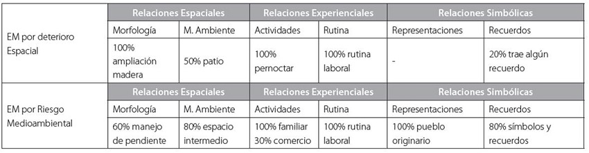 Las variables de análisis de los lugares migrantes se resumen en la siguiente tabla 3, en la cual se analiza cómo los habitantes establecen relaciones espaciales y experienciales con estos lugares, no así la relación simbólica en el EM por deterioro espacial. Aquí los migrantes entienden que están sólo de paso y que, por lo tanto, no establecen relaciones simbólicas con los lugares en los cuales habitan.