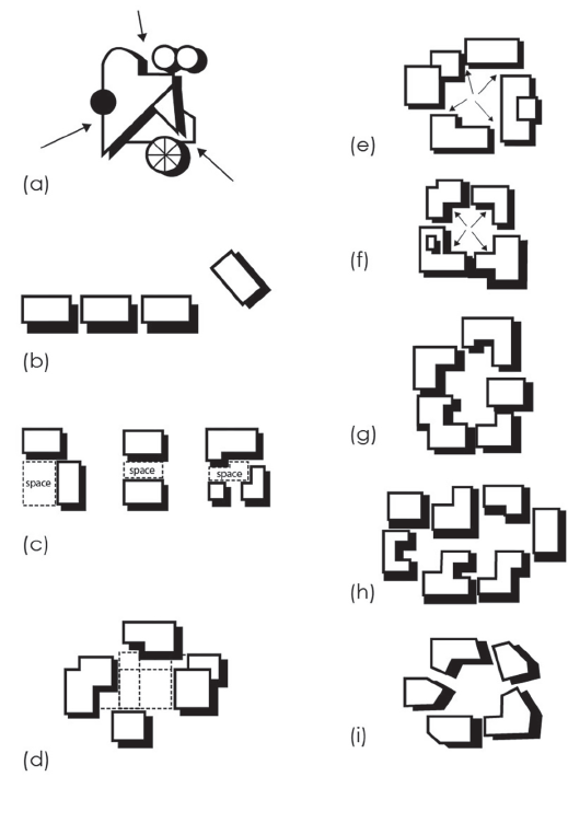 Se presenta el concepto de confinamiento espacial como la relación geométrica y proporcional entre el ancho y la altura de vacíos y edificaciones; es decir, la relación espacial entre lo construido y los espacios abiertos (Carmona, 2010, p.183). Booth (1983) analiza los parámetros de contención espacial de elementos en el paisaje, estableciendo una estructura de varias posibilidades de configuración denominada espacio positivo a partir de la relación geométrica entre el espacio vacío (la plaza) y los elementos que lo contienen (las edificaciones circundantes) (Figura 1). Booth evidencia que los resultados, en términos de forma urbana, tienen influencia directa en la experiencia y uso del espacio. Autores contemporáneos coinciden en que la condición controlada y proporcionada de confinamiento es una característica necesaria para el diseño de espacios urbanos que se adapten apropiadamente a las dinámicas sociales (Carmona, 2010; Dovey, 2016; Gehl, 2011).