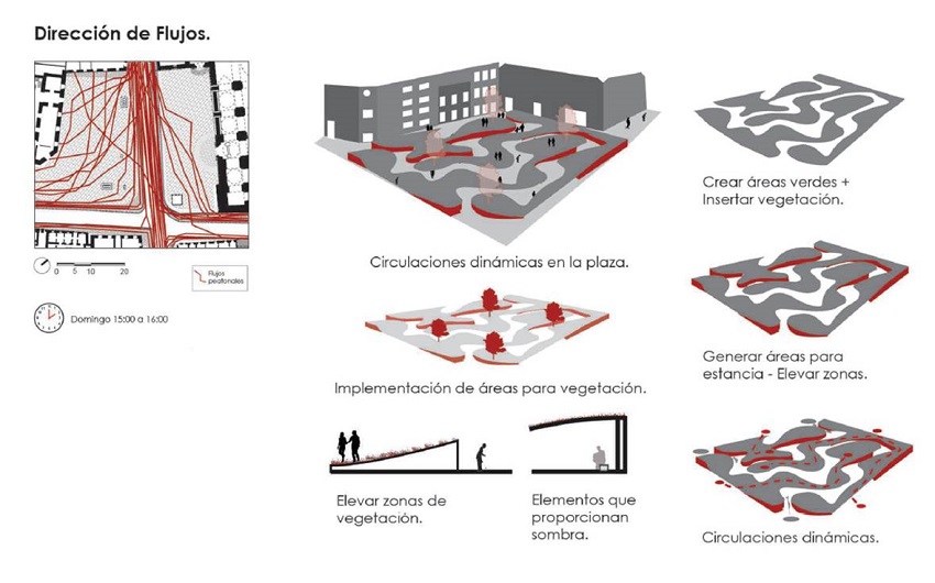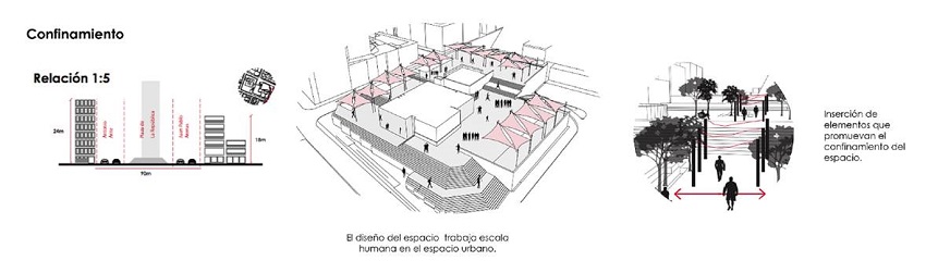 En relación con la plaza La República y su problemática principal respecto de la geometría, la proporción del vacío y la disposición de los elementos arquitectónicos que no configuran el esquema de espacio positivo, se recomienda la creación de espacio positivo a escala humana. Por un lado, se sugiere un cambio de proporciones y confinamiento con vegetación, mientras que otra posible alternativa considera la construcción de elementos arquitectónicos como límite, con la finalidad de potenciar diversidad de actividades con distintas distancias proxémicas y el incremento de los flujos en el centro de la plaza. Se entienden los nuevos elementos construidos como determinantes que condicionan el comportamiento de los usuarios del espacio (Altman & Wohlwill, 1977) (Figura 10).