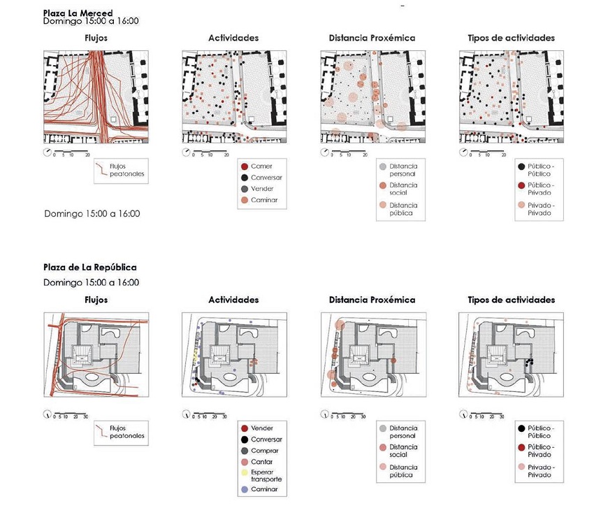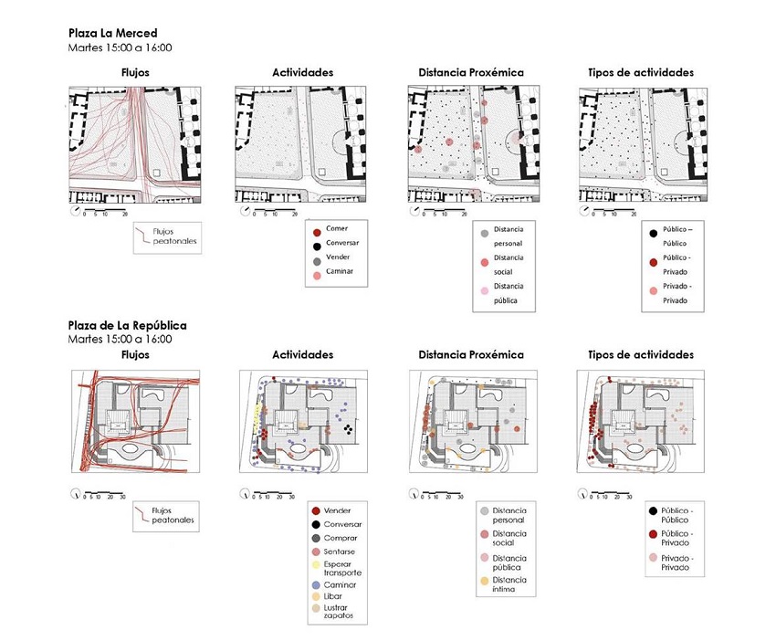 Se realizó un levantamiento con información de campo y mapeos en sitio. Se registra la temporalidad de las plazas en 24 momentos durante los años 2018 y 2019, dos días (fin de semana y durante la semana) y en tres momentos en el día (mañana, a media tarde y noche). El período de registro de datos es una hora, por lo tanto, los mapeos resultantes son un registro estático de la vida de esa plaza particular durante un período específico. La pertinencia de la selección de los casos de estudio se fundamenta en una comparación de elementos urbanos equivalentes en términos escalares, pero con vocaciones y directrices de diseño urbano claramente diferenciadas. La plaza La República es una de los escasos ejemplos de plazas funcionalistas en la ciudad de Quito, mientras que la plaza La Merced es uno de los pocos esquemas urbanos correspondientes a una estructura tradicional que no ha sufrido grandes modificaciones en el siglo XX.