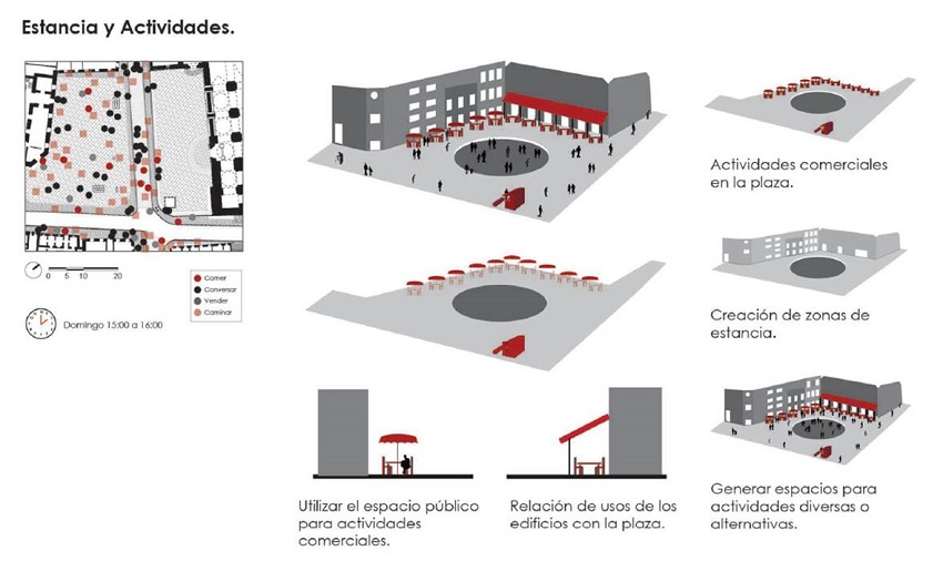 La plaza La Merced aprovecha los flujos peatonales y genera una configuración acorde para la disposición de mobiliario urbano, con diferenciación de zonas de estancia y de circulación. Es posible la disposición de áreas de recorridos y estancias en el espacio público en función del movimiento de los usuarios (Figura 8). Otra posible recomendación como escenario es integrar las actividades comerciales con los objetos adyacentes y espacios de estancia (Figura 9).
