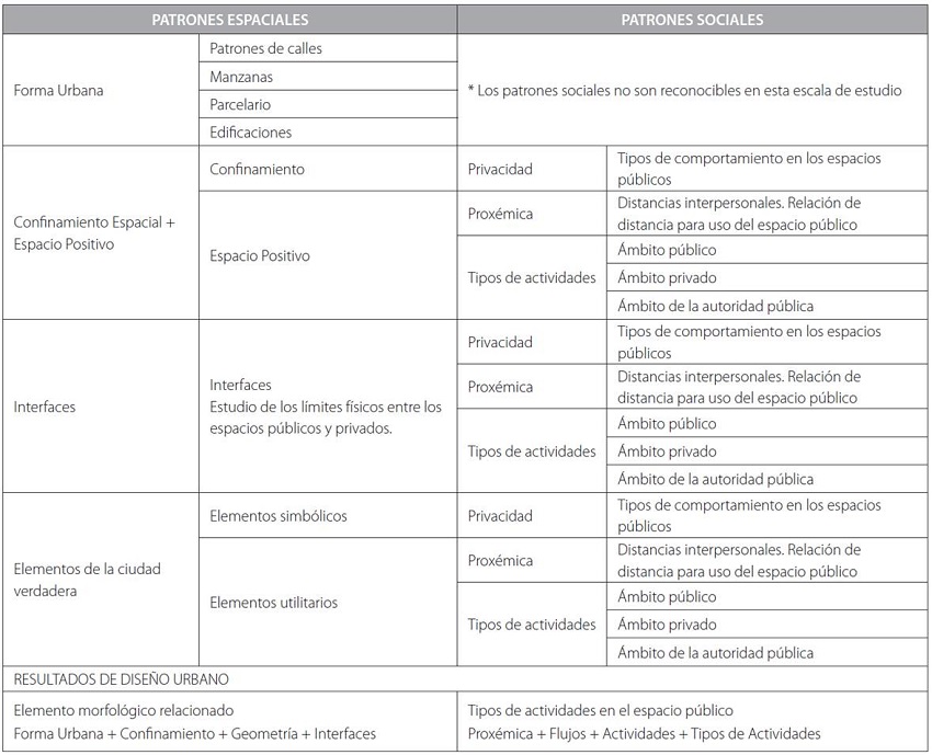 Para los patrones espaciales se estudia la morfología, valores espaciales de geometría y tamaño de elementos. Además, se analizan las relaciones geométricas de proporción para establecer confinamiento y espacio positivo y se estudian las interfaces, los elementos simbólicos y utilitarios de la ciudad. Como patrones sociales se analizan las condiciones de privacidad, proxémica y tipos de actividades en cuanto a los ámbitos sociales (Tabla 1).