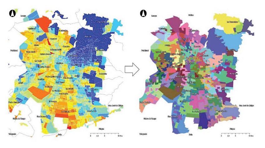 Identificación de unidades territoriales-socioeconómicos. El análisis requirió la integración de los datos en función del territorio para explorar relaciones espaciales entre las tres variables: categoria de peso infantil, condiciones socioeconómicas de la población y su acceso a la oferta alimentaria. Se realizó un análisis geoestadístico con el fin de identificar unidades terrritoriales con niveles socioeconómicos similares. Estos permiten un análisis con mayor precisión que el nivel comunal, que es particularmente compleja en aquellas comunas con mayor heterogeneidad socioeonómica. Se realizó un proceso de clusterización geográfica con el uso del software GeoDa, el cual permitió agrupar zonas según nivel socioeconómico y proximidad, ambos criterios igualmente ponderados (ver Figura 1).