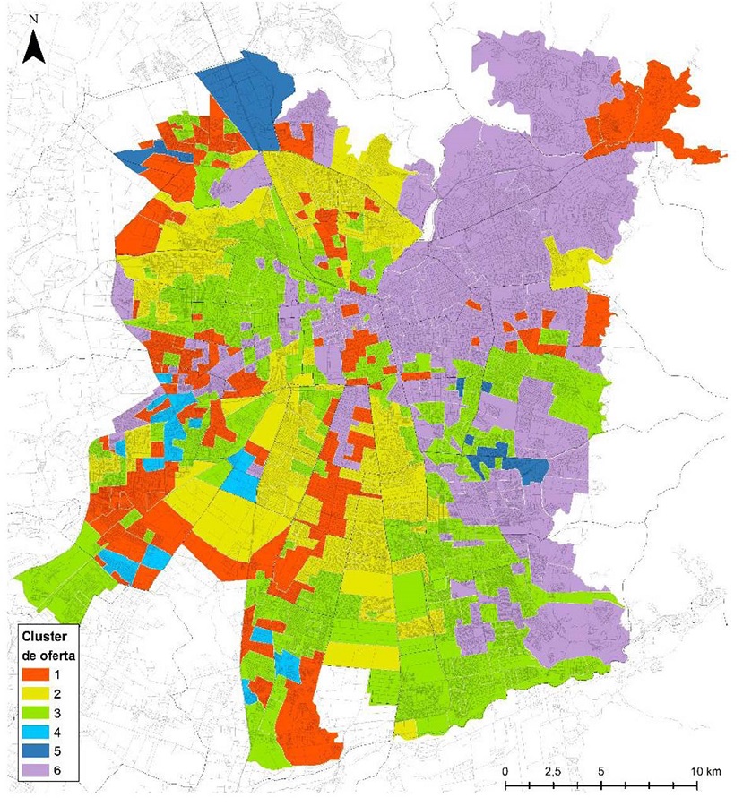 En este segundo paso (2 en la Figura 7), se identifican las configuraciones de oferta alimentaria en la ciudad a través de la zonificación elaborada, creando una síntesis de tipologías desde una clusterización de K-medias con los indicadores de oferta por sector. Esto último se discutirá en la siguiente sección.