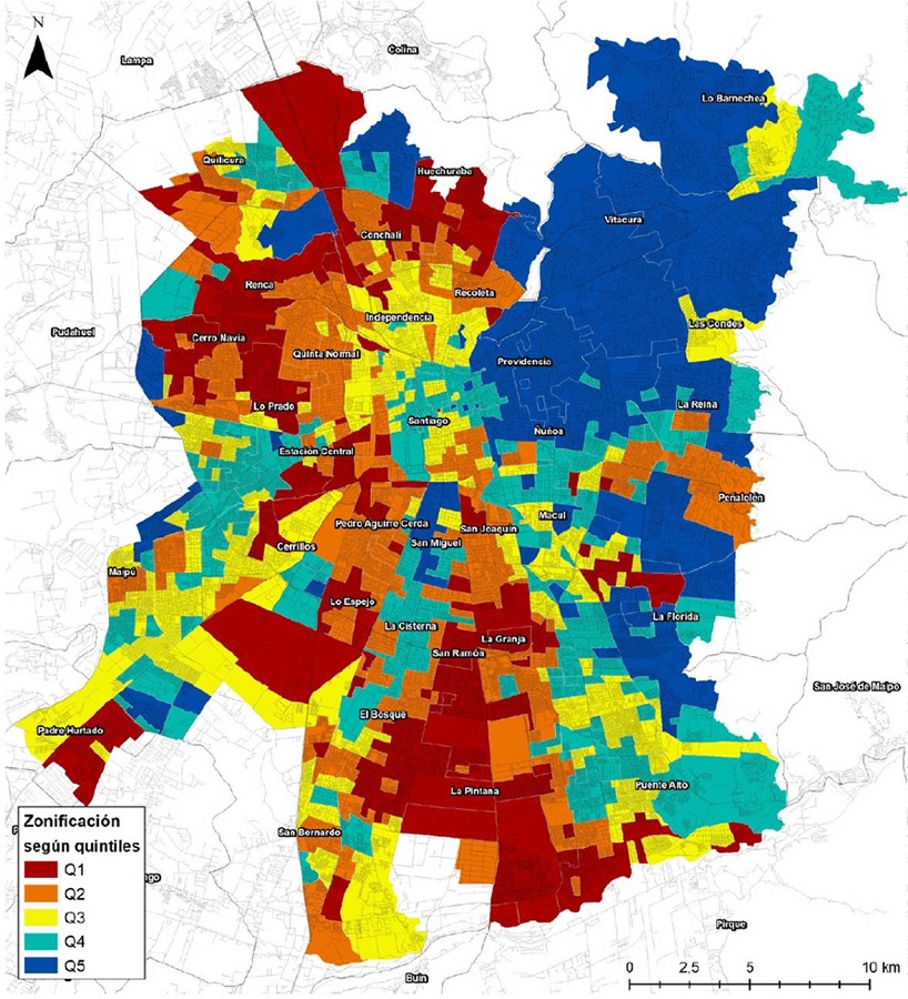 Cada unidad territorial-socioeconómica fue asignada el NSE promedio de los hogares en la unidad. En la Figura 2, graficamos las unidades territoriales-socioeconómicas organizadas en quintiles NSE, donde el primer quintil (Q1) es el grupo de menor nivel socioeconómico. Se observan altos niveles de segregación socioeconómica en el Gran Santiago.