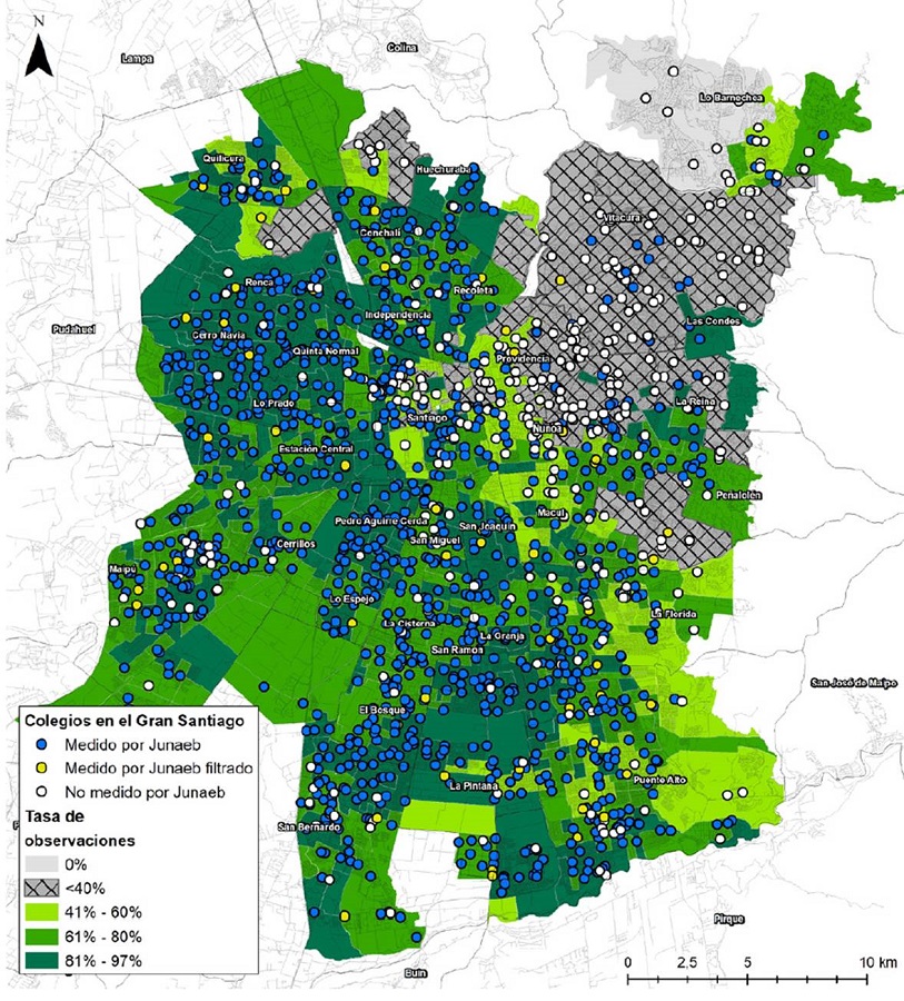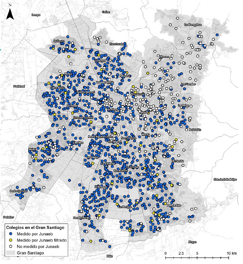 Fueron filtrados 56 colegios, quedando 1.113 (disminución de 4,8%) y un total de 57.741 estudiantes (disminución de un 0,13%). Como se observa en el mapa (Figura 3), estos pareciesen tener una distribución heterogénea por la ciudad, lo que nos lleva a pensar que su exclusión no sesga los resultados.
