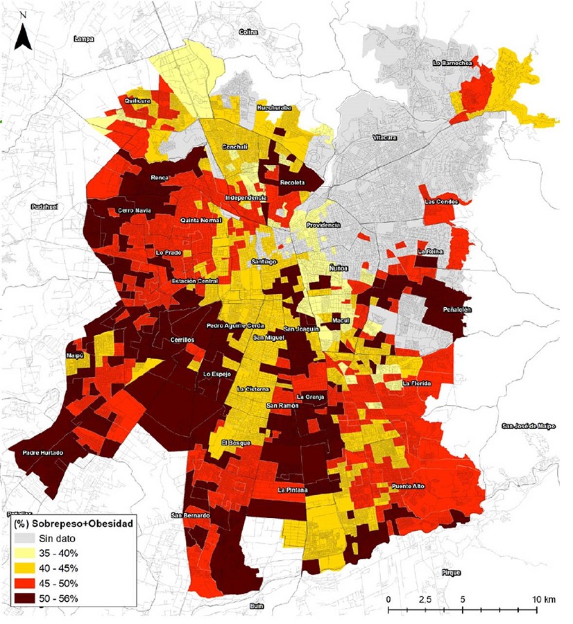 El caso del Gran Santiago, con un delimitado sector de altos ingresos al noreste de la ciudad y barrios de bajos ingresos al sur y al oeste de la ciudad, es expresivo de diferencias significativas en todas las variables analizadas. Destaca que las zonas que tienen mayor prevalencia de obesidad infantil son barrios segregados con bajo nivel socioeconómico. A su vez, la presencia y distribución de las categorías de oferta de alimentos varían según estas condiciones, y podrían constituir un factor fundamental para el análisis de las oportunidades para acceder a la alimentación saludable en las grandes ciudades.