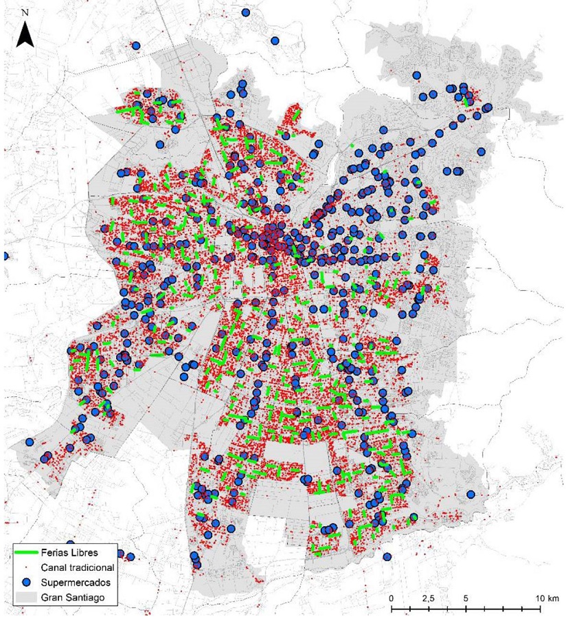 En la Figura 6 se mapean los establecimientos comercializadores de alimentos diferenciando por tipo de oferta (supermercado, feria libre o canal tradicional).