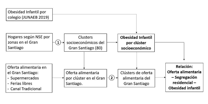 El análisis se hizo mediante la organización y combinación de bases de datos públicas y técnicas de análisis espacial, creando mapas de diagnóstico que examinan la oferta alimentaria incluyendo, por un lado, ferias libres, supermercados y canales tradicionales, y por otro los niveles socioeconómicos e índices de masa corporal infantil, para luego analizar su expresión espacial de forma integrada.