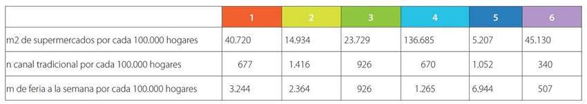 En la tabla 1, podemos observar una gama de ambientes alimentarios que incluye sectores bien abastecidos con un mix de oferta variado (tipo 1) y sectores en los que predomina un tipo de oferta, como es en el tipo 2 para el canal tradicional o el tipo 6 con supermercados.