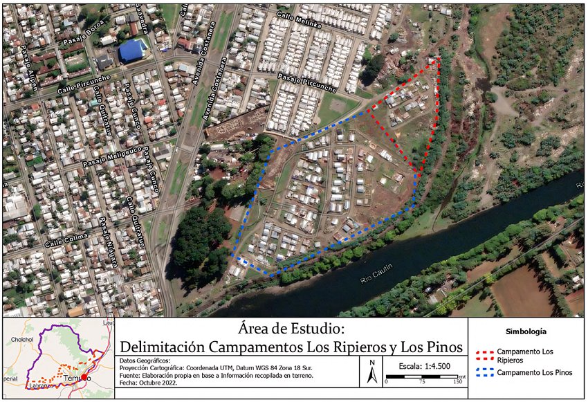 Los dos campamentos estudiados2 se ubican en terrenos baldíos de Temuco, a lo largo de la ribera del Río Cautín (Figura 1). Históricamente, estos lugares fueron el punto de asentamiento para migrantes rurales durante las primeras décadas del siglo XIX los que, ante la rápida consolidación urbana, no encontraron espacio en la ciudad (Rojo-Mendoza e Hidalgo, 2021).