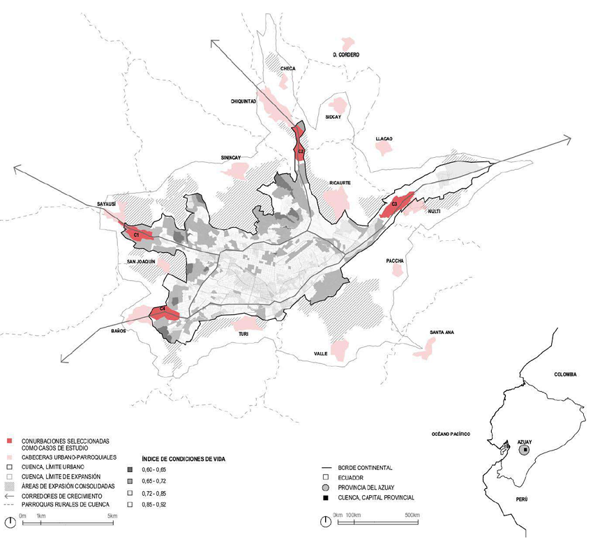 Durante la selección de casos, se encontró que la expansión de la periferia de Cuenca, está marcada por una dependencia física y de servicios entre sus cabeceras parroquiales rurales y la ciudad consolidada (Hermida et al. 2015). Esta periferia cuenta con un crecimiento visiblemente acentuado en torno a los corredores viales que conectan el casco urbano con estos centros poblados que circundan la ciudad (Cabrera, 2016) (Figura 1). Adicionalmente, los sectores con Índice de Condiciones Vida (ICV) más bajos se ubican en las periferias, a excepción de la conurbación de Nulti donde el ICV es uno de los más altos de la ciudad (Orellana y Osorio, 2014) (Figura 1).