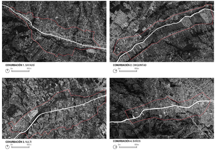 Bajo estas consideraciones, se establecieron como criterios de inclusión de muestra que las conurbaciones debían: (1) formar parte de la franja borde de la ciudad, catalogada en la ordenanza como área urbana en proceso de consolidación; (2) ser colindantes a una cabecera parroquial rural y (3) haberse desarrollado en torno a un corredor vial o expansor urbano principal. Las conurbaciones seleccionadas fueron Sayausí, Chiquintad, Nulti y Baños (Figura 2).