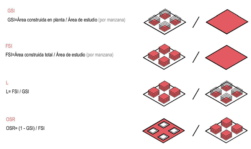 Las morfologías se clasificaron de acuerdo a su nivel de dispersión construida usando Spacematrix, una herramienta empírica de enfoque cuantitativo que tipifica configuraciones urbanas a partir del levantamiento de cuatro indicadores métricos: intensidad construida (FSI), compacidad construida (GSI), altura (L) y amplitud (OSR) (Berghauser y Haupt, 2021). Los indicadores se calcularon utilizando la misma serie de datos: área de estudio por manzana, área construida y área sin construir; lo que demandó la obtención de dimensiones a partir de datos cartográficos, fotografías aéreas y visitas de campo. De acuerdo a la herramienta, la compacidad (GSI: Ground Space Index) se calcula dividiendo la superficie construida en planta baja para el área de estudio por manzana, siendo equivalente al COS (Coeficiente de Ocupación del Suelo) en Ecuador según la normativa vigente. La intensidad (FSI: Floor Space Index) se calcula dividiendo la superficie edificada total para el área de estudio por manzana, siendo, en cambio, equivalente al CUS (Coeficiente de Uso de Suelo). La altura (L: Heigh) se calcula dividiendo FSI sobre GSI, o, en otras palabras, la superficie construida en altura sobre la construida en planta baja. Por último, el espacio abierto o amplitud (OSR: Open Space Relation), que indica la relación entre el espacio sin edificar y el área construida en cada manzana, se calcula restando GSI del área de estudio y dividiendo el valor resultante para FSI (Berghauser y Haupt, 2021) (Figura 3).