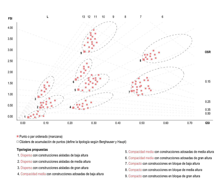 Una vez levantados los indicadores, este conjunto de cuatro datos se vuelve un punto en el plano cartesiano. El par ordenado (x,y) está determinado por los valores calculados en cada manzana y de acuerdo a los clústeres formados por puntos (manzanas) en ciertas zonas del plano, se clasifican las morfologías de acuerdo a los criterios definidos por Berghauser y Haupt (2021) (Figura 4).