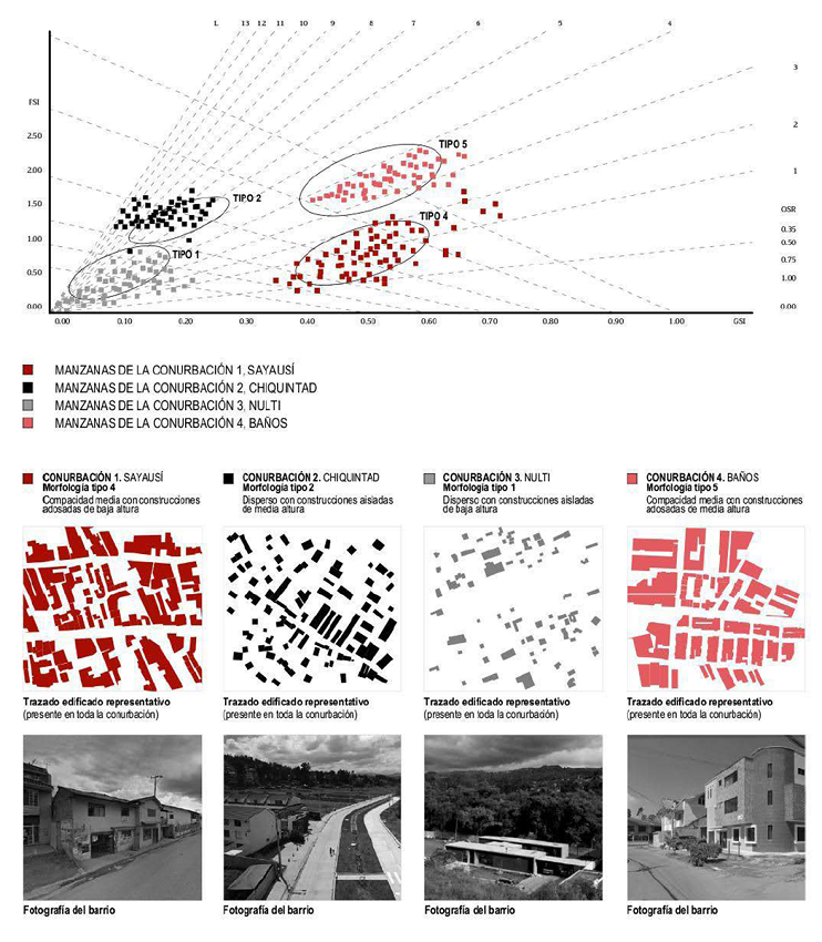 Las tipologías dispersas 1 y 2 presentan bajos índices de intensidad construida (FSI) y bajos índices de cobertura construida (GSI). La diferencia entre ambas radica en la altura de sus edificaciones (L) y la superficie de retiros, o áreas no construidas por manzana (OSR). En la tipología morfológica 1, de Nulti, se midió mayor superficie de retiros, generalmente en los cuatro frentes de las viviendas y las construcciones son más bajas que en Chiquintad, de tipología morfológica 2. De la misma forma ocurre con las tipologías de compacidad media 4 y 5, Sayausí y Baños, donde la de mayor altura (L) y menor espacio abierto (OSR) es la de morfologías tipo 5, de Baños.