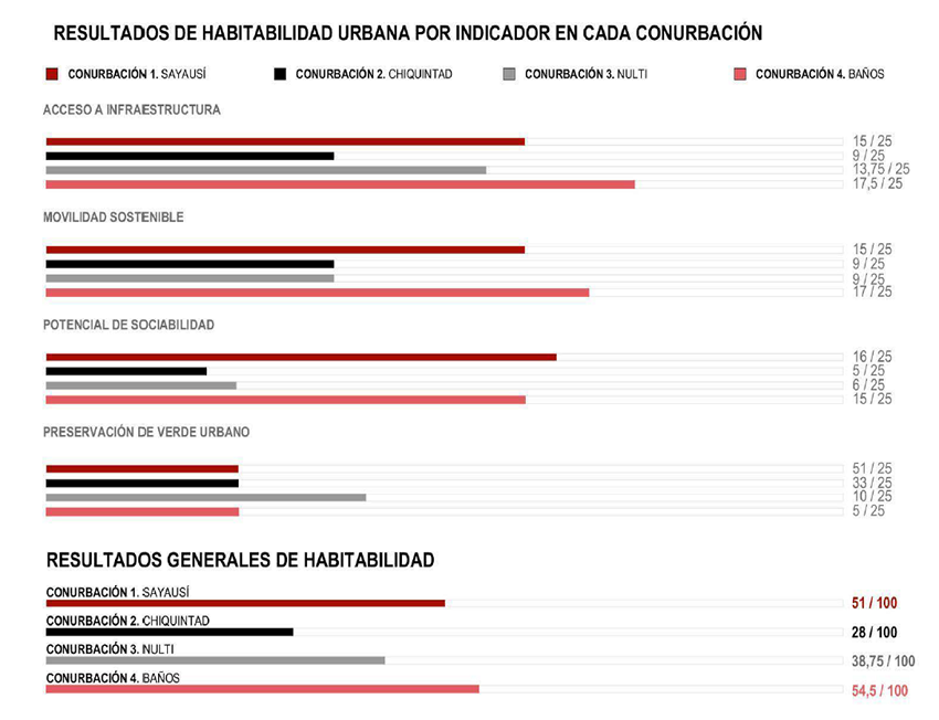 Los hallazgos de la evaluación de habitabilidad urbana, señalaron deficiencias de acceso a infraestructura, movilidad sostenible, potencial de sociabilidad y preservación de verde urbano en los cuatro barrios periurbanos. Tras evaluar cada indicador en la Escala de Likert de la tabla propuesta, se obtuvo de manera global que la conurbación Sayausí alcanzó 51 de 100 puntos, Chiquintad 28, Nulti 38.75 y Baños 54.5 (Figura 6).