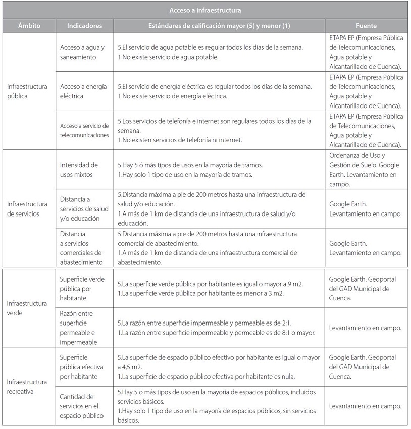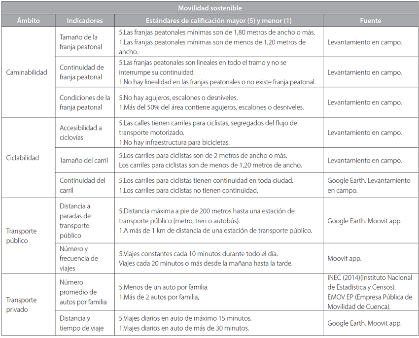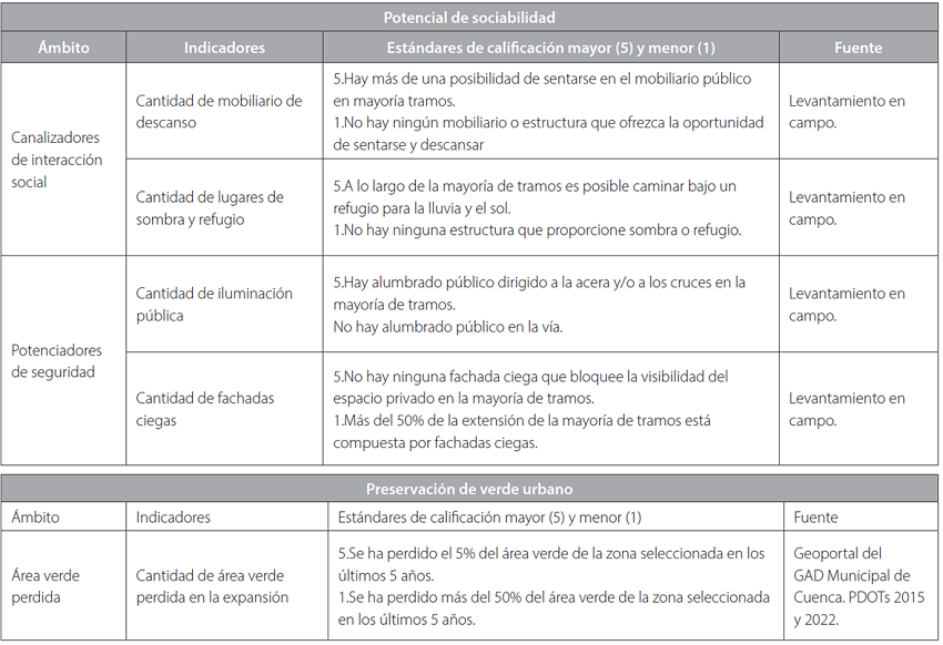 La evaluación de la habitabilidad urbana se realizó usando una tabla de indicadores adaptada y puntuada en la Escala de Likert, de acuerdo a estándares establecidos por metodologías afines (Moreno, 2008; Rodas, 2019; Segarra, 2021). La tabla abarca cuatro parámetros generales de calificación: acceso a infraestructura, movilidad sostenible, potencial de sociabilidad y preservación del verde urbano. Estos criterios fueron identificados como recurrentes en estudios previos realizados en la región, lo que respalda su relevancia y aplicabilidad en este contexto (Moreno, 2008).