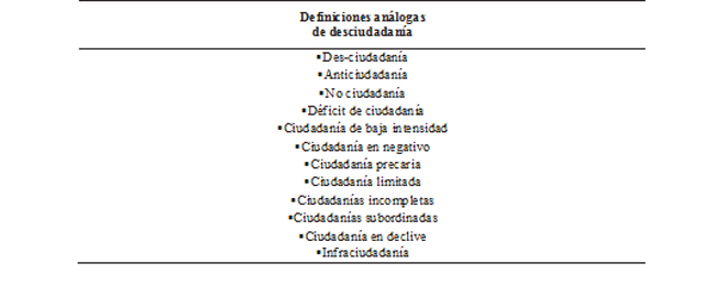 Ahora bien, habiendo precisado que para este estudio se asumirá el neologismo desciudadanía como noción conceptual y operacional, pero -en aras de ofrecer un acercamiento más inclusivo del tema, por demás poco tratado- también se incorporarán otras denominaciones, y sus autores, que enriquezcan la comprensión y discusión al respecto.