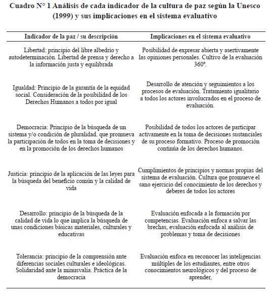 Si se analizara cada indicador o valor a la cultura de paz, según la Unesco (1999): la libertad, la igualdad, la democracia, la justicia, el desarrollo y la tolerancia, tendríamos que: