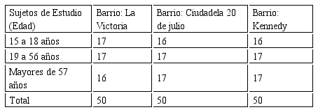 Para efectos de la aplicación del instrumento, se tomaron tres barrios: Kennedy, Veinte de Julio y La Victoria, en los cuales se aplicó la encuesta a cincuenta personas por barrio; dichas comunidades fueron seleccionadas por ser sectores que han mostrado mayores niveles de participación en la dinámica social, política y administrativa frente a la Administración Pública Distrital, sin embargo es de anotar que los habitantes de estos barrios cuentan con algunos centros de infraestructura tecnológica para acceder a la gestión pública electrónica, sin embargo aun contando con algunos avances tecnológicos se hace continua la presencia de los habitantes en las oficinas del orden público y privado.