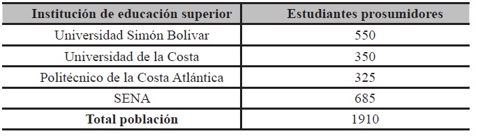El muestreo en esta investigación es probabilístico, simple y estratificado por cuanto todos los sujetos de la población tienen la misma probabilidad de ser incluidos en el muestreo. Es estratificado porque se efectúa sobre la base de los estratos de la población. Se trabajó con base en 331 estudiantes de las instituciones de educación superior de Barranquilla (Colombia): 95 de la Universidad Simón Bolívar, 61 de la Universidad de la Costa, 56 del Politécnico de la Costa Atlántica y 119 del SENA.