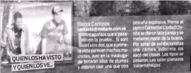 Queda refrendado este proceso a través del léxico: «encapotados, «machos machotes», «botaron las plumas», «dejaron caer una pestaña explosiva»,«lata pareja», «se metieron mano», «exhibicionistas», «los sacó del closet». Como puede observarse, esta disputa procura anclarse en una violencia, en cierto modo, «positiva», dado que su objetivo es la preservación de lo«permitido». No es menos importante la foto que los muestra públicamente o la leyenda colocada a pie de foto («Quien los ha visto y quien los ve»). Esta última apela a un recurso cultural nada desestimable: una expresión perteneciente al refranero popular, que desde el punto de vista paremiológico, se refiere a un «cambio», a una «transformación». El «cambio» que, en este caso, se crítica corresponde a ese paso de la hombría al terreno censurable de la exposición pública de una afectividad homoerótica.