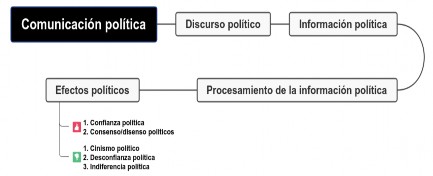 La definición anterior convoca, a su vez, a proponer un modelo a través del cual se pueda engranar este proceso. Para ello me fue útil verlo a través de la metáfora de la cascada. A saber: toda comunicación política se materializa en los discursos (en un sentido amplio) dados en condiciones de producción específicas para ser, socialmente, distribuidos bajo, también, específicas condiciones. De los discursos, la gente selecciona la información que le interesa, dado que, en política, no todo lo expuesto es aceptado por los receptores. Posteriormente, los sujetos deciden y filtran lo seleccionado a través de sus marcos (valores, creencias, ideología). Una vez procesada la información (aislado lo que se rechaza de lo que se acepta), se producen los diferentes efectos políticos (aptitudes) posibles con los que cada sujeto o grupo se posiciona en cuanto a su acción pública4: positivos (confianza y buscar consensos/gestionar disensos políticos) o negativos (cinismo, indiferencia y desconfianza políticos). Tendríamos una secuencia como la siguiente: