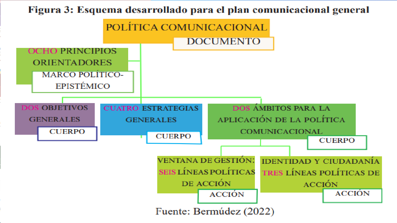Con todo lo anterior a cuestas, nos dedicamos a la tarea de diseñar un plan que orientara el despliegue comunicacional de la institución. Lo central fue pensarlo desde el control epistemológico presentado en la figuraMe gustaría ofrecer ahora, muy brevemente, en qué consistió cada uno de los aspectos incorporados al esquema. Ahí se pueden detectar cada uno de los contenidos seleccionados en relación con el propósito planteado. Para aumentar la precisión del trabajo, hubo el apoyo en preguntas claves como: