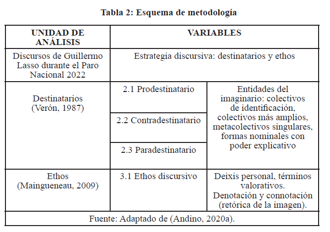 La metodología de esta investigación es cualitativa al darle una perspectiva interpretativa para entender los significados, en este caso, de discursos en un contexto. El objetivo es analizar las estrategias discursivas del presidente de Ecuador, Guillermo Lasso, durante el Paro Nacional 2022. El diseño es no experimental y transversal al recoger información del 12 al 30 de junio de 2022.
