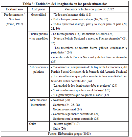 Los colectivos de identificación suelen ser los que potencian la unificación de un nosotros explícito como entidades enumerables. En este caso, eso se remite a una identificación política de élites, al nombrar a algunas agrupaciones políticas de la Asamblea: Izquierda Democrática, Partido Social Cristiano y la Bancada del Acuerdo Nacional (CREO y sus aliados independientes). Menciona a esa articulación como la “unidad de los demócratas”, colocándose de manera diferencial ante los que llama no- demócratas. De igual forma ocurre al mencionar como sus prodestinatarios, a quienes buscan el diálogo y no quieren caos, para marcarlos en oposición a los manifestantes.