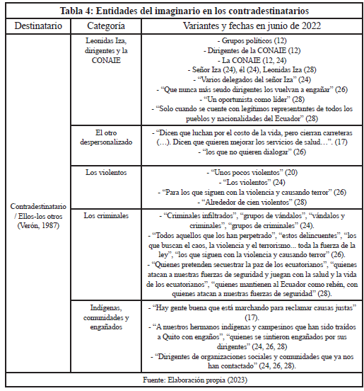 Lasso desarrolló una amplia construcción de la otredad, en este caso, mediante la delincuentización o criminalización como entidades recurrentes, lo que termina siendo parte de la formación de imaginarios mentales sobre la protesta social como una barbarie con actos irracionales. Esas entidades devienen en estereotipos sobre la movilización, al tomar una parte del todo y convertirla en totalidad para deshistorizar las luchas. También pretendió personalizar el conflicto, visibilizando a Leonidas Iza para deslegitimarlo como líder social, omitiendo que se trata de acciones colectivas y heterogéneas de protesta.