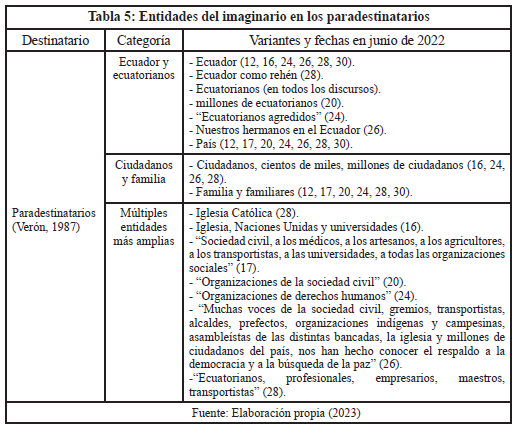 Se presentan las categorías “familia” y “familiares”, como ideas también abarcativas presentes en 6 de los 8 discursos, tomando esa concepción de launidad social mínima y su énfasis en nuestra matriz cultural. Otra estrategia discursiva del mandatario fue la enumeración de múltiples identidades más amplias, una heterogeneidad de agrupaciones sociales que no son parte del campo político institucional, pero sí parte de la sociedad civil. Es un agradecimiento directo a algunos paradestinatarios que han impulsado el diálogo, mientras que evoca directamente a esas otras agrupaciones para que se unan a su propuesta de consenso. Lasso coloca a todas esas entidades (aunque sean colectivos sin militancia política específica) como víctimas, rehenes de quienes impulsan y actúan en el paro nacional, con la intención de que se adhieran a su ‘nosotros’ ante las movilizaciones.