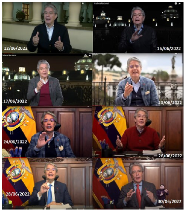 Sobre los momentos de la protesta, la imagen también da algunas pistas. En las cuatro primeras (12, 16, 17 y 20 de junio), Lasso aparece en el Palacio de Carondelet, en tres imàgenes se coloca desde la terraza con un fondo que identifica que estaría en Quito. Se visibilizan elementos cercanos a la presidencia, como las cúpulas de la Catedral Metropolitana. La intención es mostrar que se mantiene en el sitio simbólico del poder presidencial con su ethos de competencia para estar al mando de la situación, lo cual resulta una interdiscursividad diferencial ante otros episodios en que, debido a las protestas, los entonces mandatarios cambiaban la sede a otras ciudades o-tras ser derrocados- se iban del sitio.
