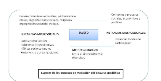 Ahora bien, según lo reseñado anteriormente, las mediaciones son esas instancias, espacios o lugares, como lo señaló Martín Barbero (1993, 2008), que están presentes en el proceso donde los sujetos interactúan, usan y se apropian de los mensajes construidos por los medios de difusión. Esta conceptualización encierra principalmente dos aspectos: el primero es que deja claro que no se está pensando un sujeto estático y ni idéntico, sino en múltiples subjetividades constituidas en una dialéctica permanente entre el discurso de la modernidad y el de la resistencia.