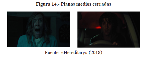 El plano medio cuando es cerrado (desde el pecho) se emplea para capturar las expresiones faciales de los personajes en momentos de intensa emoción o revelación. Estos planos, especialmente en los rostros de Annie y Peter, permiten que el espectador se sumerja en la angustia, el dolor o el terror que experimentan. Las expresiones faciales se convierten en un vehículo para transmitir el trauma intergeneracional, destacando las tensiones internas que consumen a los personajes. Las connotaciones de este tipo de plano en«Hereditary» (2018) giran en torno a la intensidad emocional y la pérdida de control, ya que el rostro es el único elemento visible, obligando al espectador a confrontar el sufrimiento o el miedo de manera directa.