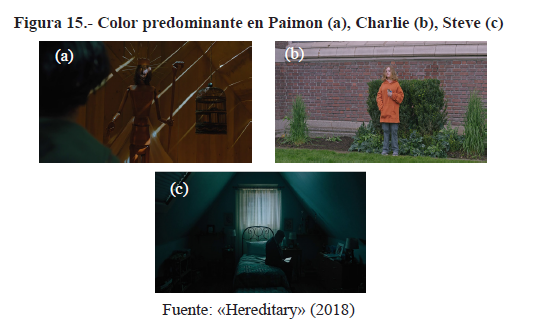 Desde el inicio del filme, se utiliza una paleta cromática para establecer los ejes de tensión entre lo sobrenatural y lo real. El demonio Paimon (entidad sobrenatural y latente en el entorno de la familia Graham) es asociado principalmente con tonos ocre, mientras que Charlie es representada por el color naranja. Esta diferenciación se apoya en una teoría cromática básica: tanto el ocre como el naranja son colores contiguos en el círculo cromático RGB (Delgado y otros, 2021), lo que sugiere una proximidad conceptual entre el demonio y su huésped. Sin embargo, al no ser Charlie el huésped definitivo de Paimon, el naranja se presenta como una variación del ocre, lo que denota una disonancia entre ambos.