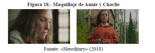 Con respecto al maquillaje, en «Hereditary» (2018) su uso juega un papel crucial tanto en la creación de atmósfera como en la construcción de los personajes. El maquillaje en el cine no es solo un elemento estético, sino un signo que comunica significados culturales, psicológicos y simbólicos (Ramírez, 2021).