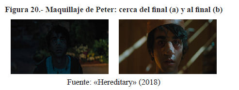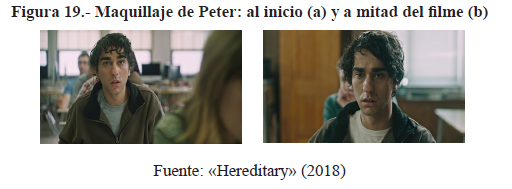 En escenas clave, después de haber experimentado momentos de intenso terror o dolor, el maquillaje de Peter resalta las consecuencias físicas. Las heridas y contusiones en su rostro, acentuadas mediante maquillaje, subrayan el costo que tiene para él el enfrentamiento con lo sobrenatural. Estas marcas son signos semióticos del castigo físico que acompaña su sufrimiento emocional, tomando en cuenta que en «Hereditary» (2018) lo mental y lo físico están profundamente entrelazados.
