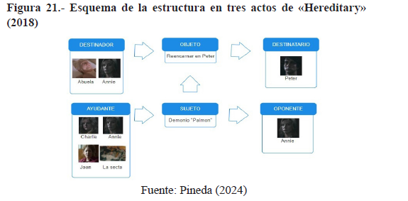 Paimon es el Sujeto debido a que es el actante que hace posible el desarrollo de la narrativa. Tiene la función de alcanzar al Objeto, en este caso, una situación y es reencarnar en Peter.El Destinador está representado por la abuela y Annie, porque son ellas quienes motivan a Paimon a reencarnar en Peter: la abuela lo hizo a través de un rito mientras vivió y Annie al invocar de manera involuntaria a Paimon durante el rito en su casa para «contactar» a Charlie. El Destinatario es representando por la Peter, en virtud que es el ser escogido para «recibir» a Paimon.El Ayudante está representado por Charlie, por ser el primer «recipiente» de Paimon; Annie es quién lo «invoca» y posteriormente lo «contiene» transitoriamente; Joan, al ser una sacerdotisa, se encarga de que el ritual sea completado; y la secta, porque son los que coadyuvan a Joan a ejecutar su tarea. El Oponente también es representado por Annie, debido a que ella,al descubrir las intenciones que tuvo su madre (la abuela) evita a toda costa que el ritual se ejecute.