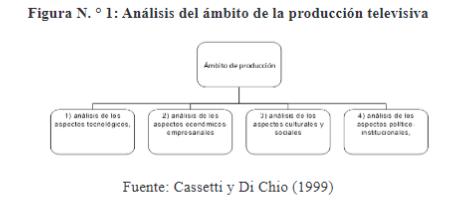 Inicialmente, esta investigación se acoge a los postulados de Casetti y di Chio (1999), quienes esbozaron a finales del siglo pasado tres núcleos temáticos para estudiar la televisión (producción, oferta y consumo) y 34 métodos de análisis. El estudio de la producción televisiva –el que aquí compete– está relacionado con los aspectos tecnológicos (1), económicos- empresariales (2), culturales y sociales (3) y políticos-institucionales (4), como puede visualizarse en la siguiente figura:
