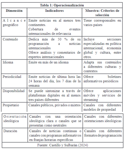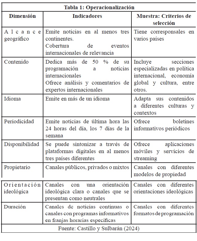 La muestra de las cadenas internacionales de información televisiva fue seleccionada de manera intencional, contemplando criterios como relevancia mundial, diversidad de idiomas y regiones geográficas, entre otras especificaciones como su origen territorial y el área de transmisión (internacional/mundial), como puede verse: