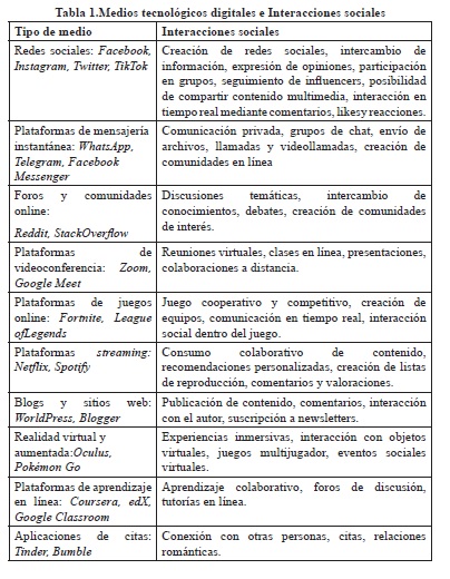 El mundo digital está en constante evolución, cada día surgen nuevas plataformas y herramientas que redefinen el modo en que las personas se comunican y relacionan con las demás, por eso, siempre estaremos expectantes con lo que ha de llegar y cómo nos va a afectar. La Tabla 1 muestra una categorización de medios tecnológicos digitales con las respectivas interacciones sociales que promueven en los usuarios.