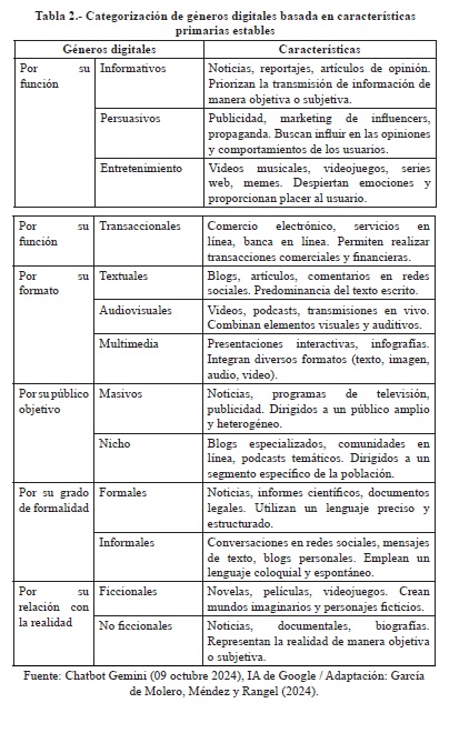 Acudimos nuevamente al Chatbot Gemini de IA de Google para obtener una lista organizada y actualizada de los productos de los medios tecnológicos digitales, agrupándolos en atención a algunas características primarias que se mantienen estables, a pesar de la constante evolución. A estos grupos deproductos tecnoculturales se les denomina géneros tecnológicos digitales. La categorización construidapuede verse en la Tabla 2.