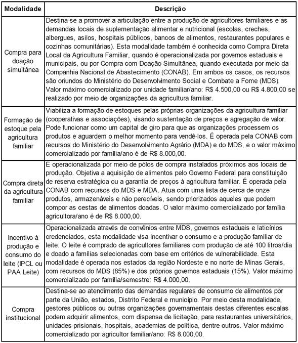 O Programa organiza-se em distintas modalidades que atendem a finalidades específicas (Quadro Nº 1), possibilitando: i) o estímulo a redes locais de produção e distribuição de alimentos oriundos da agricultura familiar para populações em insegurança alimentar; ii) a regulação de preços por meio da compra de produtos específicos destinados à formação de estoques públicos; iii) a aquisição de alimentos e formação de estoques pelas próprias organizações sociais (associações e cooperativas), visando sustentação de preços e agregação de valor; iv) a compra e doação de leite a famílias em situação de vulnerabilidade social através de um circuito público de distribuição; e, v) o abastecimento de hospitais, presídios, restaurantes universitários e outros estabelecimentos públicos com produtos da agricultura familiar. Esses diferentes mecanismos funcionam como uma espécie de "caixa de ferramentas" acionada pelos agricultores familiares e suas organizações, podendo operar em distintas escalas, ajustandose às diferentes realidades locais (Medeiros et al., 2011).