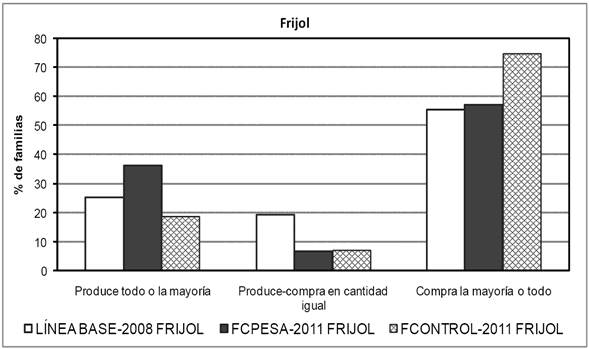 Con respecto a la producción de frijol, se tiene que en el 2008 solo el 25% de las familias en la microrregión produjeron cantidad suficiente de frijol para el consumo familiar anual (Gráfico Nº 2). Ya en el 2011, el 36% de las familias con PESA lograron el auto-abasto anual de frijol, a diferencia del 18% en las familias control. Por el contrario, en el año 2008 el 22% de la población no cultivó frijol; en 2011 se observó que el 40% de las familias con programa y un 46% en las familias control no cultivaron este grano, por lo que tuvieron que comprarlo.